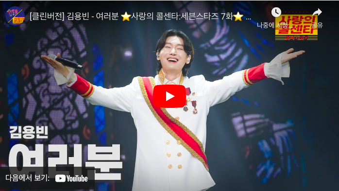 김용빈 가수의'사랑의 콜센터' 무대에서 부른 '여러분'이 팬들의 마음을 사로잡으며 또 한 번 전설을 만들어냈습니다. 미스터트롯3에서 진(眞)을 차지하며 트로트계의 황태자로 떠오른 김용빈이 이번엔 따뜻하고 부드러운 음색으로 모두의 심금을 울렸습니다. 팬들은 그의 노래에 눈물과 감동을 쏟아내며, 이 곡이 단순한 무대를 넘어 위로와 힐링의 순간이었다고 입을 모았습니다.