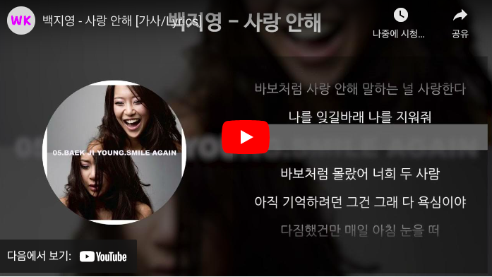'사랑 안 해'는 백지영의 감성적인 보컬이 돋보이는 곡으로, 이별 후의 감정을 솔직하게 표현한 가사와 애절한 멜로디가 특징입니다. 이 곡은 이별을 겪은 많은 이들에게 위로와 공감을 주며, 백지영의 대표적인 발라드 곡 중 하나로 자리 잡았습니다.