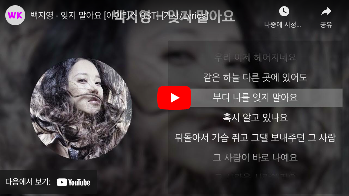 백지영의 '잊지 말아요'는 단순한 드라마 OST를 넘어, 사랑과 이별에 대한 깊은 공감을 불러일으키는 곡입니다. 이 곡을 들으며 드라마 아이리스의 감동을 다시 느껴보세요.