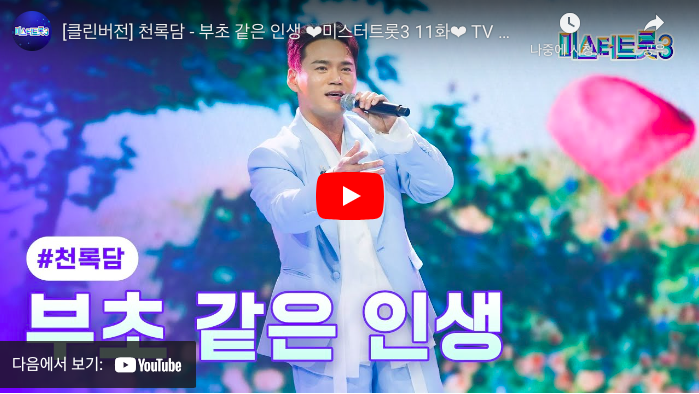 천록담은 이번 미스터트롯3 무대에서 특유의 감성과 호소력 짙은 목소리로 부초같은 인생을 불렀다. 이 곡은 인생의 무상함과 희로애락을 담은 가사로 많은 사람들에게 사랑받고 있는 곡이다. 그의 무대를 본 시청자들은 "정말 잘 부른다", "얼굴이 점점 더 좋아진다", "건강이 안 좋았었는데 그 어려움을 딛고 무대에 선 모습이 감동적이다", "이 날을 기다린 사람 같다" 등 긍정적인 반응을 보였다.