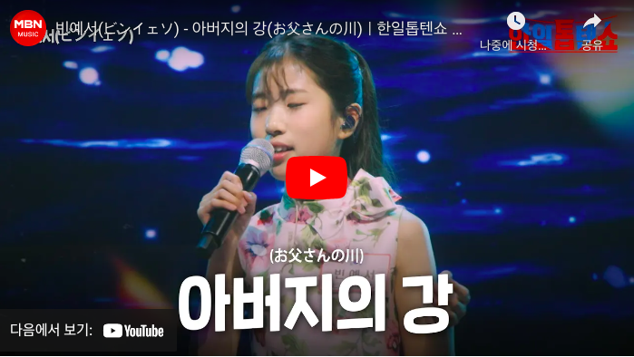 한일톱텐쇼 39회에서 12살의 빈예지가 '아버지의 강'을 불러 화제가 되었다. 어린 나이임에도 불구하고 성인 가수 못지않은 뛰어난 가창력과 감정 표현을 선보이며, 관객과 심사위원들에게 깊은 감동을 안겨주었다. 그녀의 무대는 단순한 노래가 아닌 하나의 작품처럼 다가왔으며, 많은 사람들이 그녀를 '트로트 천재'라고 부르기도 했다.