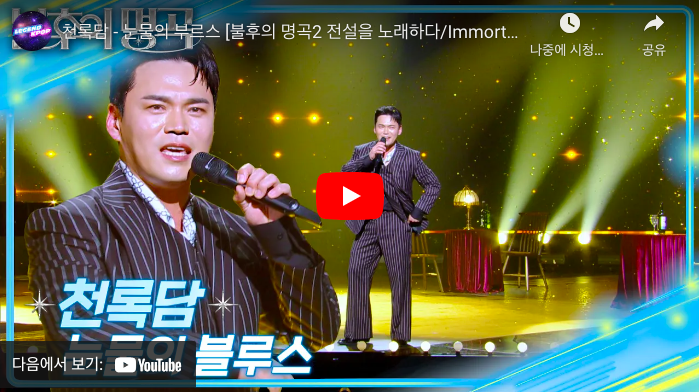 천록담이 불후의 명곡2에서 선보인 '눈물의 부르스' 무대는 많은 팬들의 마음을 울렸습니다. 이 곡은 원래 주현미 씨가 부른 곡으로, 감성적인 멜로디와 애절한 가사가 인상적인 트로트 부루스입니다.